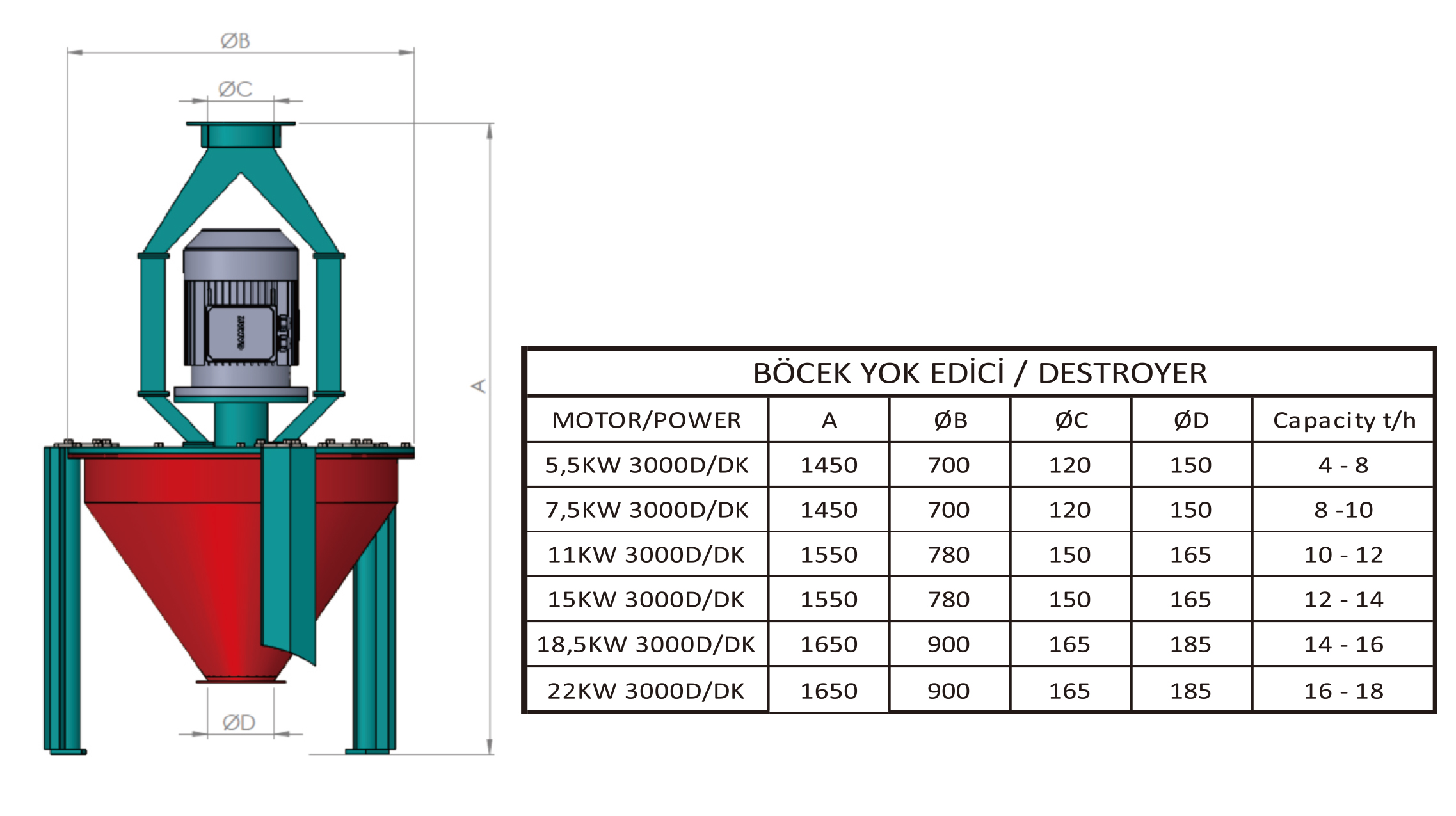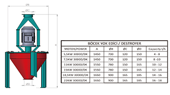 Bu makine mekanik olarak çalışmaktadır. Tahıl ve unun içindeki böcek, larva ve yumurtalarını yok etmek için dizayn edilmiştir. Bu makine içerisinde yüksek devirde dönen rotor, demir dökümden ve özel bölümden meydana gelmiştir. Motor miline bağlı olan rotorun, dinamik balansı alınmıştır. Elektrik motoru flanşlı tip kullanılmıştır.